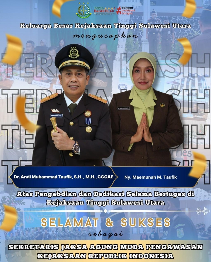 Memasuki jabatan baru sebagai Sekretaris Jaksa Agung Muda Pengawasan Kejaksaan Republik Indonesia, Kejaksaan Tinggi Sulawesi Utara menyampaikan penghormatan serta dukungan atas amanah yang diemban di tingkat nasional.