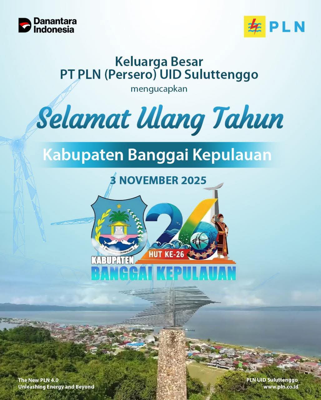 Sulut, PELOPORBERITA.ID — Keluarga besar PT PLN (Persero) Unit Induk Distribusi Sulawesi Utara, Tengah, dan Gorontalo (UID Suluttenggo) menyampaikan ucapan selamat ulang tahun kepada Kabupaten Banggai Kepulauan.