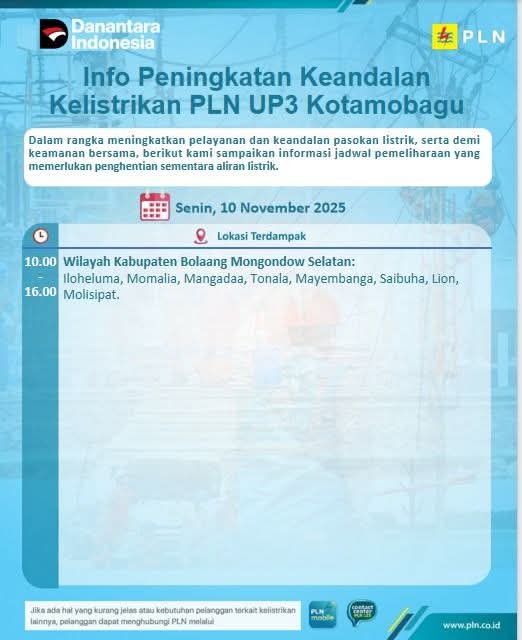 Kotamobagu, PELOPORBERITA.ID — Dalam upaya menjaga keandalan pasokan listrik dan meningkatkan kualitas pelayanan kepada masyarakat, PLN Unit Pelaksana Pelayanan Pelanggan (UP3) Kotamobagu akan melaksanakan kegiatan pemeliharaan jaringan listrik pada Senin, 10 November 2025, mulai pukul 10.00 hingga 16.00 WITA.