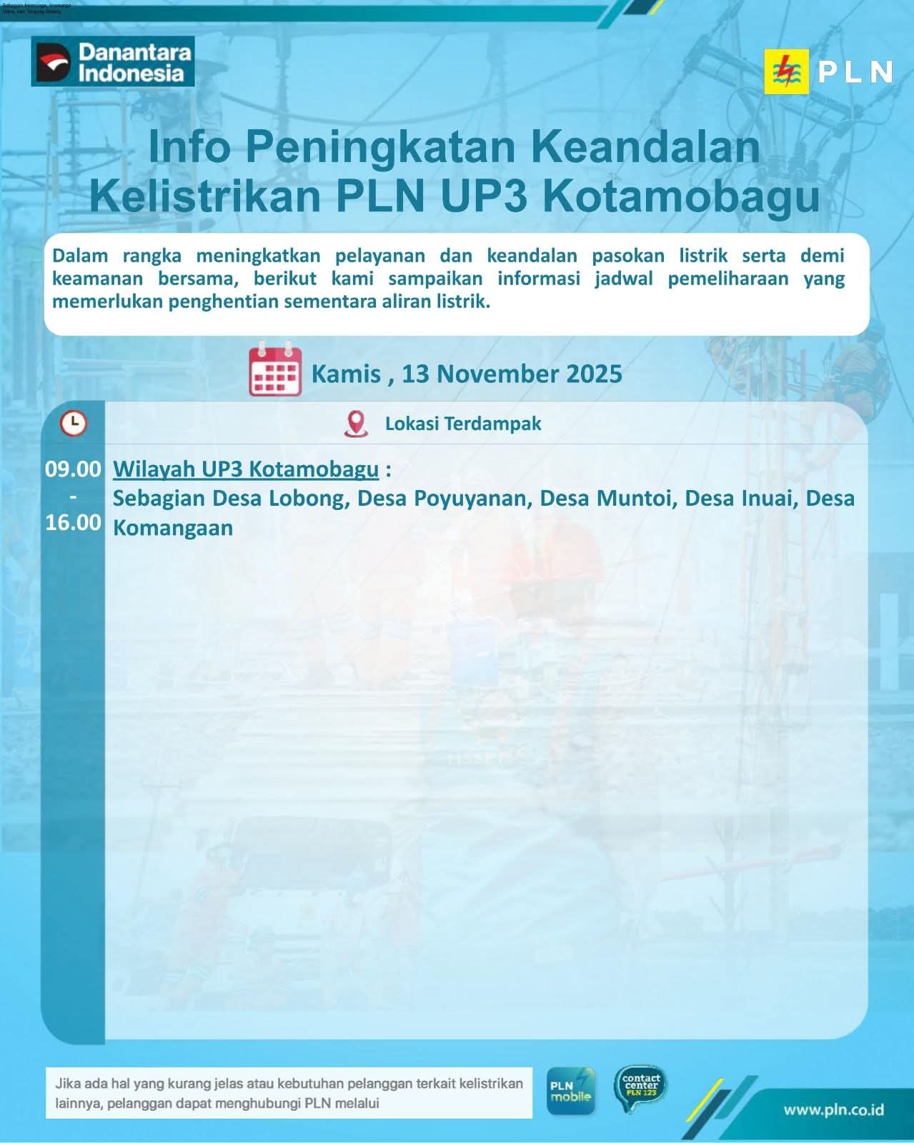 Kotamobagu, PELOPOBERITA.ID — Dalam upaya meningkatkan keandalan pasokan listrik dan menjaga keselamatan bersama, PT PLN (Persero) Unit Pelaksana Pelayanan Pelanggan (UP3) Kotamobagu akan melakukan kegiatan pemeliharaan jaringan listrik pada Kamis, 13 November 2025.