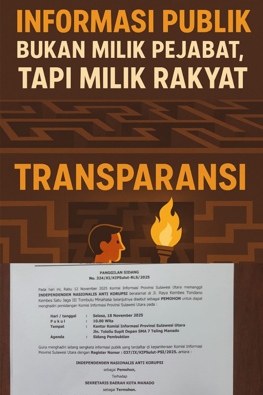 Manado, 18 November 2025 — Lembaga Swadaya Masyarakat Independen Nasionalis Anti Korupsi (INAKOR) Sulawesi Utara menyoroti secara serius ketidakhadiran Sekretaris Daerah (Sekda) Kota Manado dalam beberapa agenda sidang Komisi Informasi Provinsi Sulawesi Utara. Sidang terkait sengketa pelayanan informasi publik dengan Register Nomor: 037/IX/KIPSulut-PSI/2025 itu berkali-kali tidak dihadiri langsung oleh Sekda, meskipun panggilan resmi telah diterbitkan oleh Komisi Informasi.