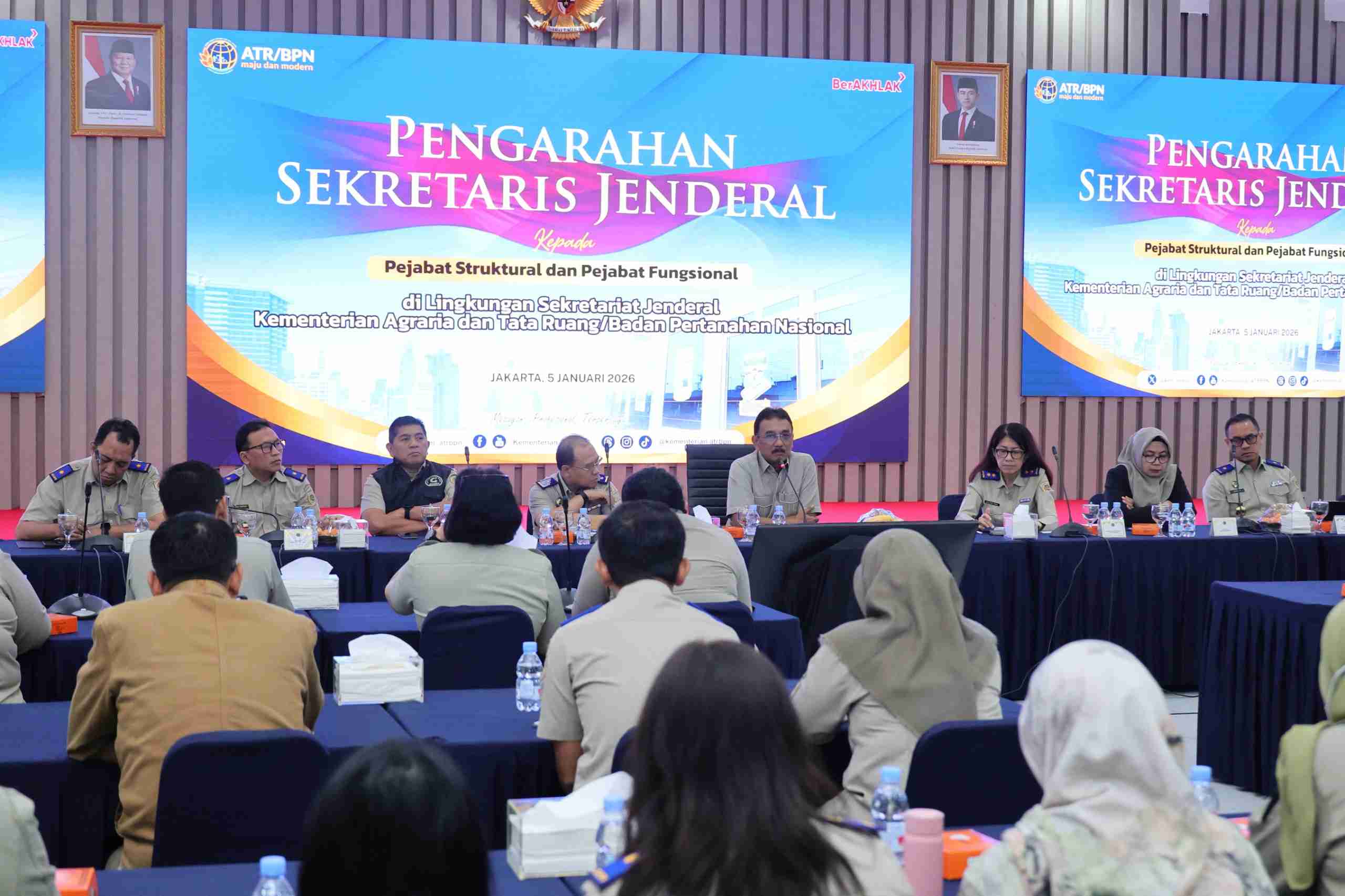 Jakarta – Menyongsong pelaksanaan program kerja tahun 2026, Sekretariat Jenderal (Setjen) Kementerian Agraria dan Tata Ruang/Badan Pertanahan Nasional (ATR/BPN) menggelar kegiatan Pengarahan Sekretaris Jenderal (Sekjen) bagi Pejabat Struktural dan Fungsional di lingkungan Setjen. Dalam kesempatan tersebut, Sekjen Kementerian ATR/BPN, Dalu Agung Darmawan, mengajak seluruh jajaran untuk memperkuat kerja sama lintas biro demi mendukung pelaksanaan program kementerian secara optimal.