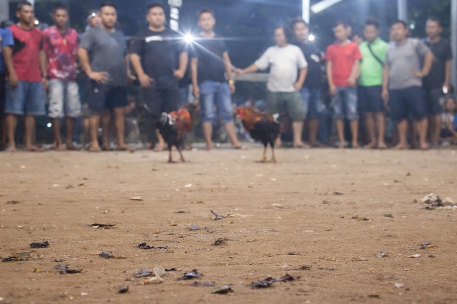 Nampak begitu banyak para pelaku sabung ayam yang sedang menikmati ayam-ayam yang sedang bertaruh didalam velt kaca tersebut.