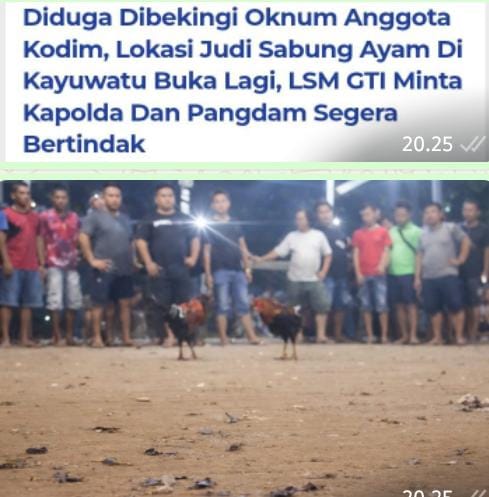 Dilansir dari salah satu Media Online yang mengatakan bahwa diduga dibekingi Oknum Anggota Kodim, Lokasi judi sabung ayam di Kayuwatu dibuka lagi.