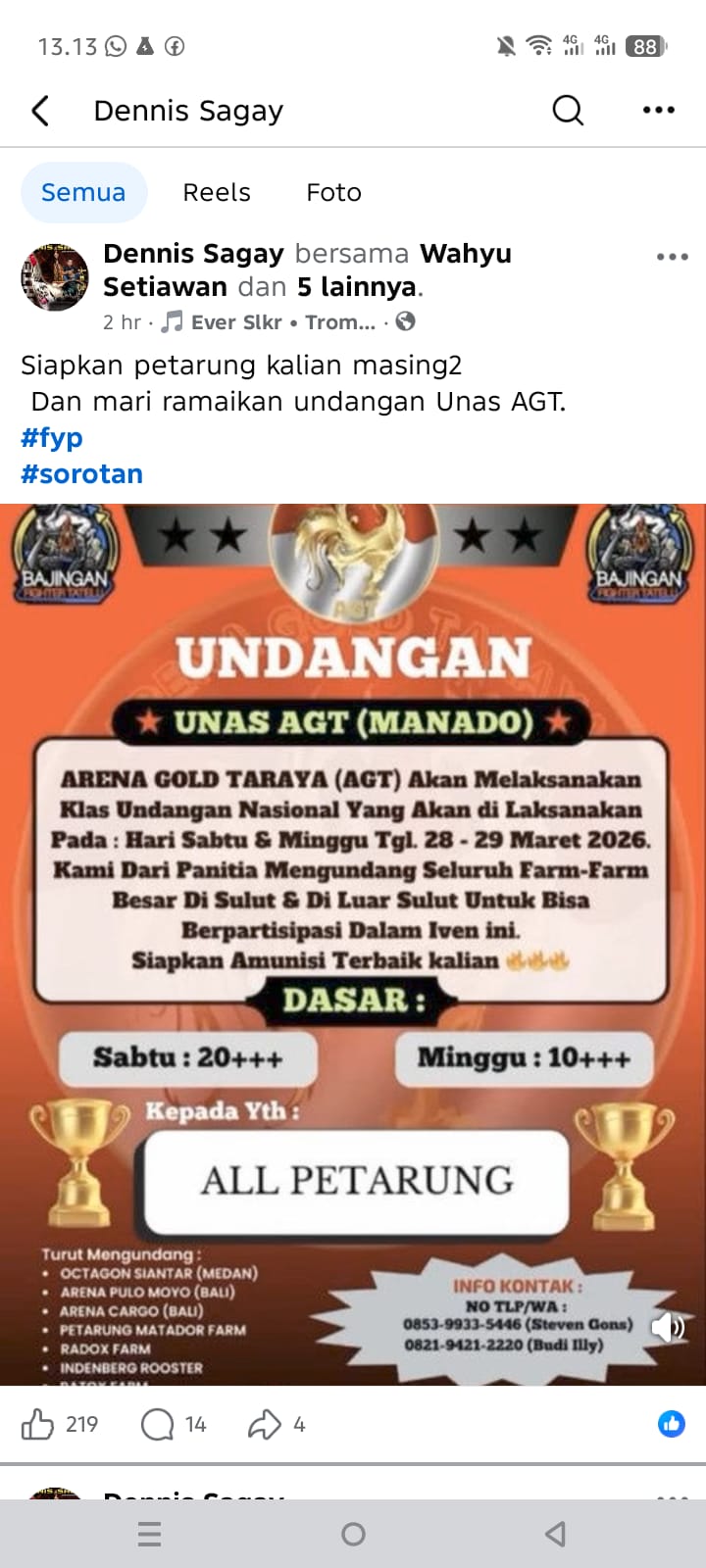 Aneh tapi nyata dan termasuk sadis, dalam akun Facebook Dennis Sagay mengundang di Media Sosial secara terang-terangan tanpa takut terhadap APH (Aparat Penegak Hukum), bahwa akan diadakan judi sabung ayam besar-besaran di Arena Gold Taraya yang lebih dikenal dengan sebutan AGT, pada hari Sabtu dan Minggu (28 – 29 Maret 2026).
